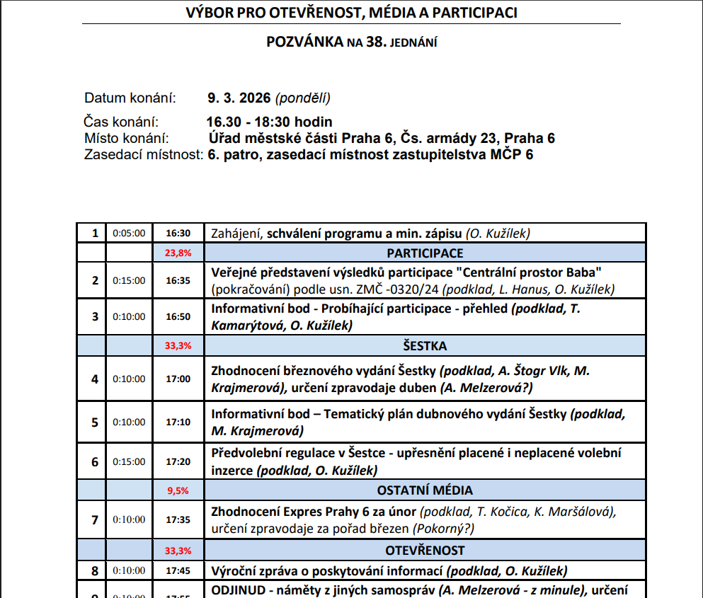 Připomínáme, že dnes od 16:30 hod. se koná na jednání Výboru pro media, otevřenost a participaci pokračování představování výsledků dotazníkového šetření tentokrát už za účasti participátora p. Hanuse. Jednání se koná v zasedací místnosti zastupitelstva Městské části Praha 6.