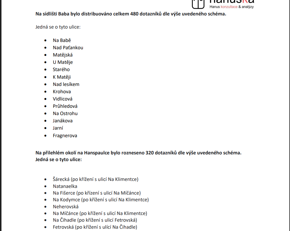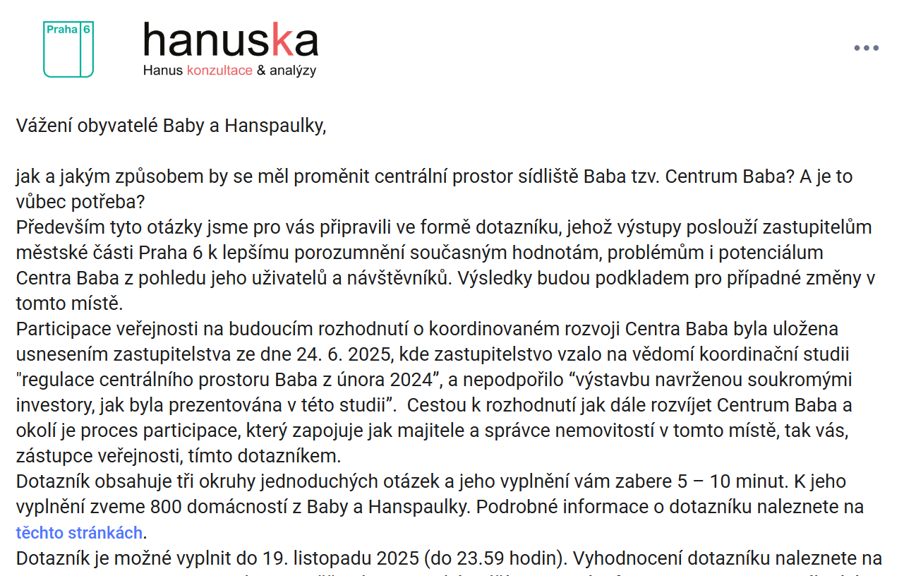 Praha 6 uveřejnila na webu Lepší6 první statistiky, nebo tedy souhrn dotazníkového šetření. Celkem bylo dle této zprávy odevzdáno 411 dotazníků. Více zde: https://lepsi6.cz/novinky/dotaznik-k-centru-baba-byl-ukoncen/1671/